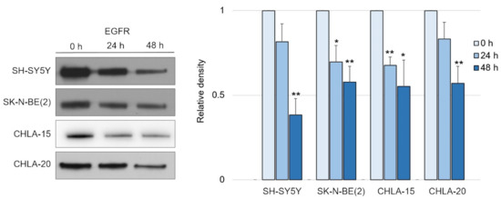 Having confirmed the potency of DpC in inducing NDRG1, we tested its effect on EGFR signaling, as was previously reported in carcinoma models [34]. Indeed, DpC succeeded in moderately decreasing the levels of total EGFR over the course of 2 days in all tested neuroblastoma cell lines (Figure 2 and Figure S3).