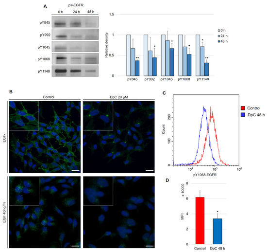 DpC downregulates the levels of phosphotyrosine-EGFR. (A) Immunoblotting of phosphorylated forms of EGFR in the SH-SY5Y neuroblastoma cell line treated with 20 μM DpC. Representative images (left) and relative optical density values (right) of three independent experiments. Source data are provided in Figure S1. Densitometry data are shown as the mean ± SD normalized to 0 h values. * p < 0.05; ** p < 0.01; two-tailed unpaired t-test. (B) Immunofluorescence micrographs of EGFR (green) in SH-SY5Y cells treated with 20 μM DpC and EGF (40 ng/mL; 10 min; 37 °C). Nuclei counterstained with Hoechst 33342 (blue). Scale bar: 20 μm. (C,D) Quantification of pY1068-EGFR protein levels in response to DpC treatment (20 μM; 48 h) in SH-SY5Y cells. Median fluorescence intensity (MFI) ± SD comprised of three independent experiments. * p < 0.05; ** p < 0.01; two-tailed unpaired t-test.