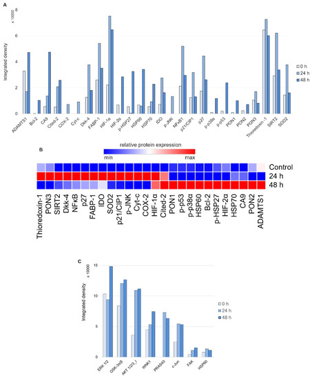 Relative total and/or phosphorylation levels of selected target proteins involved in signal transduction and the cell stress response were analyzed using the following protein array kits: Proteome Profiler™ Human Cell Stress Array Kit (Table S2) and Proteome Profiler™ Human Phospho-Kinase Array Kit (Table S3) (both R&D Systems, Minneapolis, MN, USA). The samples were processed according to the manufacturer’s protocol, and the chemiluminescence signal was quantified using ImageJ software v1.52a (U. S. National Institutes of Health) [64] and analyzed in concordance with our previous study [66].