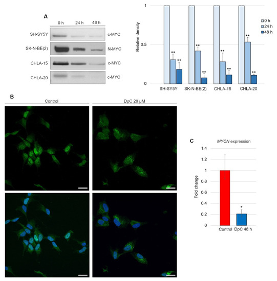 DpC downregulates MYC proteins in neuroblastoma cell lines. (A) Immunoblotting of c-MYC (SH-SY5Y, CHLA-15, CHLA-20) and N-MYC (SK-N-BE(2)) protein levels in neuroblastoma cells treated with 20 μM (SH-SY5Y) or 2 μM (CHLA-15, CHLA-20) DpC. Representative images (left) and relative optical density values (right) of three independent experiments. Source data are provided in Figure S1. Densitometry data are shown as the mean ± SD normalized to 0 h values. * p < 0.05; ** p < 0.01; two-tailed unpaired t-test. (B) Immunofluorescence micrographs of c-MYC (green) in SH-SY5Y cells treated with 20 μM DpC and EGF (40 ng/mL; 10 min; 37 °C). Nuclei counterstained with Hoechst 33342 (blue). Scale bar = 20 μm. (C) qRT–PCR analysis of the effect of 20 μM DpC on the expression of MYCN in the SK-N-BE(2) cell line. Fold change ± SD comprised of three independent experiments. * p < 0.05; ** p < 0.01; two-tailed unpaired t-test.