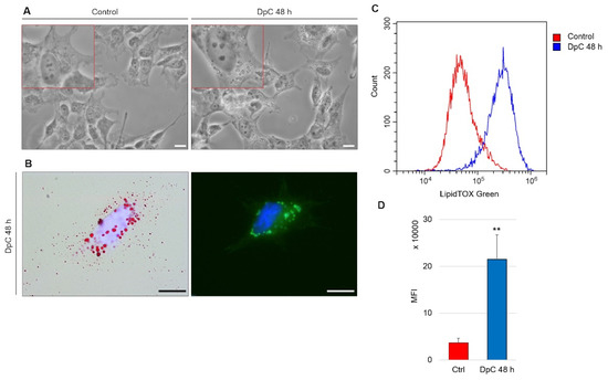 Lipid accumulation in SH-SY5Y neuroblastoma cells in response to DpC treatment. (A) Light-microscopy micrograms revealing spherical bodies in the cytoplasm of SH-SY5Y cells. (B) Neutral lipid staining of DpC-treated cells by Oil Red O (red, left) and LipidTOX™ Green (green, right). Nuclei counterstained with Hoechst 33342 (blue). Scale bar: 20 μm. (C,D) Increase in the median fluorescence intensity (MFI) of LipidTOX™ Green emission after DpC treatment. MFI ± SD comprised of three independent experiments. ** p < 0.01.