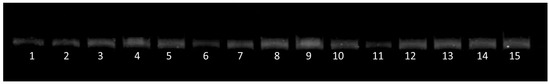 The effect of tested compounds on S. aureus topoisomerase IV activity. Decreasing amounts of 1, 2, or 3 were incubated with 200 ng kinetoplast DNA and run-on agarose gel. Lane: 1–5: compound 3 at concentrations 64, 32, 8, 2, 0.5 μg/mL, respectively. Lane: 6–10: compound 2 at concentrations 64, 32, 8, 2, 0.5 μg/mL, respectively. Lane: 11–15: compound 1 at concentrations 64, 32, 8, 2, 0.5 μg/mL, respectively.