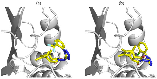 The docking was carried out in two stages. First to the binding site targeted by fluoroquinolones (e.g., Ciprofloxacin, see our previous works [34]. The fluoroquinolones bind to the DNA–enzyme complex and stabilize it in the cleaved DNA state. The molecular docking to the fluoroquinolone binding site (using the crystal structure of the DNA gyrase in complex with DNA, PDB ID: 5BTC) showed that the narrow binding cleft is not well-suited to the docked ligands. Namely, the cleft requires a planar ligand structure, such as Ciprofloxacin, rather than non-flat 1–3 compounds.