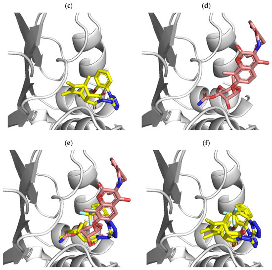 In addition to the fluoroquinolone inhibitor, there are also ATP-competitive inhibitors that target the B subunit of DNA gyrase with Novobiocin as the best-studied representative. Thus, in the second stage, we targeted the ATP-binding site. In docking, Staphylococcus aureus DNA Gyrase subunit B (crystal structure in complex with Novobiocin; PDB ID: 4URO) has been used. The docking results show that the docked 1–3 compounds occupy the ATP binding site with favorable binding energy (with ligand 1 showing a slightly higher preference for binding than other ligands, see Table 6 and Figure 3). In comparison to the Novobiocin-binding mode, the ligands mainly bind to the gyrase site that is responsible for interactions with the sugar Novobiocin moiety. In summary, the presented docking results indicate the possibility of binding to the ATP site; however, this binding mode requires further experimental confirmation.