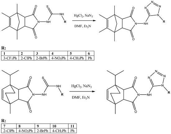 Eleven new 1H-tetrazol-5-amine derivatives were synthesized according to a well-known procedure [24]. Two types of thiourea derivatives were used. First possessing imide structure of 4,5,6,7-tetramethyl-3a,4,7,7a-tetrahydro-1H-4,7-methanoisoindole-1,3(2H)-dione and second 4-isopropyl-7-methyl-3a,4,7,7a-tetrahydro-1H-4,7-ethanoisoindole-1,3(2H)-dione. Procedures for obtaining imides and suitable thiourea derivatives were reported [26,27]. Published papers contain physicochemical and biological evaluation results. The main goal in the current design was to replace the thiourea arrangement with a tetrazole scaffold. Our approach utilizes oxidative desulfurization of thiourea substrates followed by cyclization, using sodium azide as an external nucleophile. Mercury (II) chloride was used as a desulfurization agent. Mechanism of this reaction is known. This structural modification may lead to improvement of antimicrobial activity based on our previous experiments. Both reaction schemes and conditions are depicted below (Scheme 1).