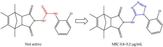 One of the study’s goals was to determine superior imide moiety (4,5,6,7-tetramethyl in compounds 1–6 or 4-isopropyl-7-methyl in compounds 7–11). Containing 4,5,6,7-tetramethyl moiety, derivatives 1, 2, and 3 showed significant antimicrobial results. In the second group of synthesized compounds, we observed no similar leading structures. Finally, the primary outcome of the study was achieved. Transition from substrate imide-thioureas [29] to imide-tetrazole derivatives resulted in a spectacular increase of antimicrobial properties. Most of the substrates were inactive against standard bacteria strains; for only four (out of twenty-six derivatives), good activity was established. Such synthetic transition followed by antimicrobial activity improvement is depicted below (Scheme 2).