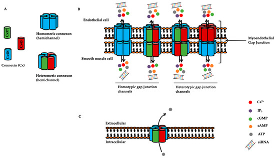 Structure of hemi-channels and gap junctions. (A) Six connexins assemble to form a homomeric or heteromeric connexon (also known as hemi-channel). (B) Two connexons from adjacent cells dock with each other to form a gap junction (homotypic or heterotypic) which allows the exchange of molecules less than 1 kD in molecular weight such as Ca2+ (calcium), IP3 (inositol triphosphate), cGMP (cyclic guanosine monophosphate), cAMP (cyclic adenosine monophosphate), ATP (adenosine triphosphate) and siRNA (small interfering RNA). (C) The connexon can also permit the release of molecules such as ATP (adenosine triphosphate) from the intracellular to the extracellular space.