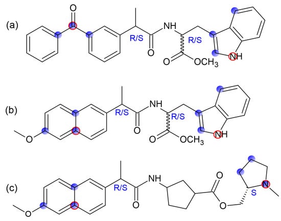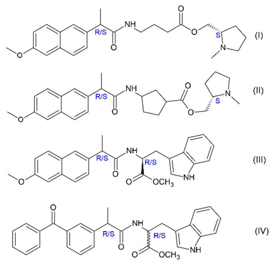 Chirality plays a crucial role in many issues, beginning from the fundamental problem of the origin of life on the Earth up to the development of new functional materials [1]. Biomolecules such as proteins and DNA are known to consist of L-amino acids and D-sugars. Until recently, the homochirality of proteins was believed to be maintained during the lifespan of an organism. However, proteins with D-amino acids have been detected in various tissues, and their amounts have been shown to increase with organism aging. According to recent studies, the replacement of L-amino acids by D-analogs during aging is one of the causes of Alzheimer’s and Parkinson’s [1,2]. It was found that optical isomers may undergo so-called chiral inversion—conversion of one optical configuration to another one under various conditions, e.g., change of temperature, solvent, under UV irradiation, action of enzymes and other chiral substances, etc. [1]. On the other hand, the chirality of biomolecules also produces rigid requirements on the pharmaceutical industry, since the optical isomers of drugs (enantiomers) often have different and sometimes opposite therapeutic activities [3]. Currently, more than half the drugs on the market are chiral compounds, and most of them are still produced in the form of racemates (equimolar mixtures of two enantiomers) [3]. Numerous biochemical studies do not provide a final answer to the question of why enantiomers with identical physico-chemical properties demonstrate such differences in living organism [4]. Thus, the difference in biological activity of enantiomers of both chiral drugs (xenobiotics) and amino acids (structural components of biomolecules) are challenging problems. Certain successes in this direction in the last decade are associated with the use of linked systems with two chiral centers [5]. Investigations of model systems—dyads where molecule of chiral drug linked with chiral electron donor seem to be promising to address this problem since elementary processes in such donor–acceptor dyads are believed to simulate binding of drug molecule with amino acid residue in active site of enzyme. For example, spin chemistry and photochemistry studies of dyads involving naproxen enantiomers linked with (S)-N-methylpyrrolidine (I, II) and (S)-tryptophan (III) (Figure 1) revealed several peculiarities of electron transfer (ET)—stereo- and spin selectivity [6]. Recent studies have also shown spin selectivity in dyads where enantiomers of naproxen and ketoprofen linked with (R)-tryptophan (III and IV).