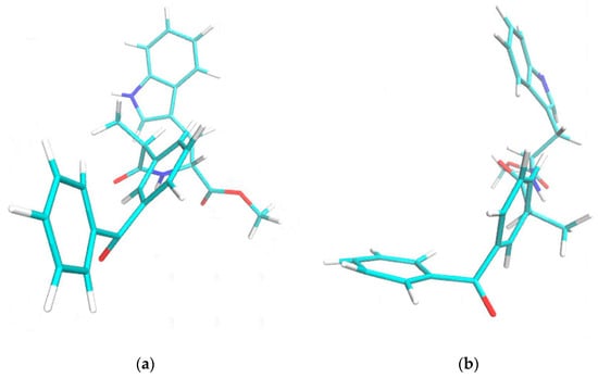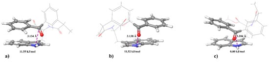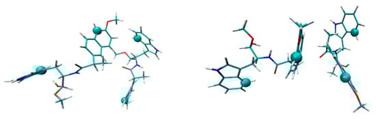 According to Table 10, (S,S)-isomer has the lowest energy whereas (S,R)- and (R,S)-isomers have the same difference in Gibb’s energy values calculated under solvent conditions (acetonitrile, implicit solvation). Concerning distances between the nitrogen atom of the tryptophan moiety and the carbon atom of ketoprofen, there are no significant differences between the isomers (Table 11). Molecular structures of dyad IV isomers in Cartesian coordinates (XYZ-files) are presented in Supplementary Materials (Section S4).