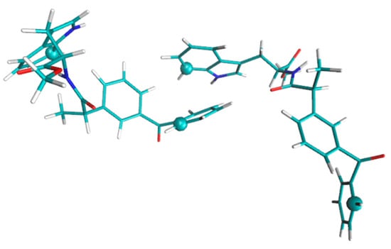 The optical isomers of dyad IV have been studied using quantum chemical modeling. The first step was conformational analysis in Jaguar software (QM Conformer and Tautomer Predictor) [30] for each of the studied systems. Next, the most suitable conformers with minimal distances between the nitrogen atom of the tryptophan fragment and the carbon atom of the ketoprofen fragment were taken. The next step was the implicit accounting optimization (PCM) [31] of acetonitrile using the Jaguar software [30] using the M06-2X-D3/cc-pVTZ (-f) method [32,33].