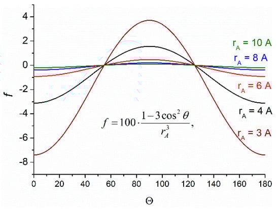 Expressions that determine the polarization in the optical isomers of dyad IV are described in Supplementary Materials (Section S3). Below is a qualitative analysis of the obtained expressions. Figure 8 demonstrates the dependence of electron dipole–dipole interaction (A) on θ at different distances between paramagnetic centers in BZ.
