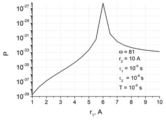 Analysis of the dependences of hyperpolarization value (P) on θ at different distances in the reaction zone (r1 = 3 A and 4 A) demonstrate complete elimination of hyperpolarization at any used residence times of the system in the reaction zone. For clarity, below is shown the dependence of hyperpolarization on the distance in the reaction zone at fixed angles θ, distance out of the reaction zone, and lifetimes in these zones (Figure 9).