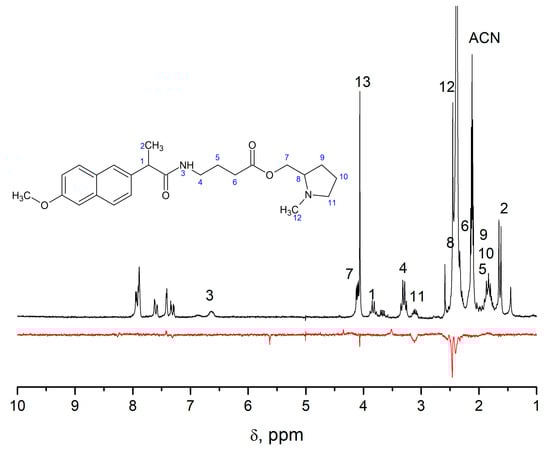 The photo-CIDNP was performed as pseudo steady state (PSS) experiments. To carry it out, a standard pulse sequence was used: presaturation; delay 1; pulse τ(π); delay2 (16 laser flashes with repetition rate 50 Hz during delay2); observation pulse τ(π/2); acquisition. Delay1/delay2 ≈ 1.1 to remove residual signals of solvents and solutes. After laser irradiation, the 1H NMR spectra of products were recorded. Further, the typical 1H NMR and CIDNP spectra of dyads I, III, and IV in acetonitrile-d3 are presented (Figure 10, Figure 11 and Figure 12).