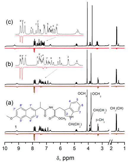 1H NMR and CIDNP spectra of three optical configurations (R,S)-, (S,R)-, and (S,S)- of dyad III are pictured below. Note that NMR and CIDNP spectra for (R,S)- and (S,R)-enantiomers are the same (Figure 11a,b).