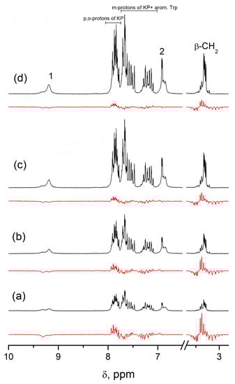 Despite this, described in the literature, dyads with KP, where donors are N-methylpyrrolidine, cholesterol, and tryptophan, demonstrate CIDNP effects with different signs for the initial dyad and products [8,9]. Since the escape of radicals into the bulk is impossible in a linked system without its cleavage, we assume that the appearance of different signal signs of the initial dyads and products is the result of the loss of spin correlation. It occurs in the triplet state of the biradicals.