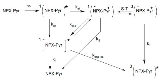 The path of the CIDNP formation under the UV irradiation of dyads I–II, where naproxen (NPX) linked with N-methylpyrrolidine (Pyr) [5]. The quantitative aspects of photoexcitation degradation are described in detail in Supplementary Materials (Scheme S1).