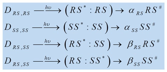 Photoinduced processes occurring in homo-(DRS,RS, DSS,SS) and hetero-DRS,SS chiral dyad dimers; α and β—CIDNP enhancement coefficient, α >> β; RS#, SS#—polarized dyads.