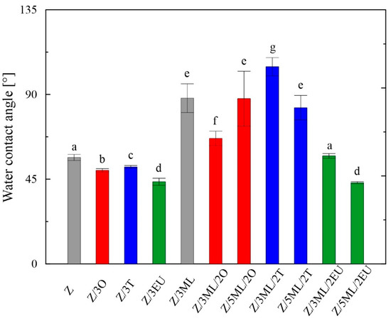 Wettability of zein-based films: Z, zein; O, oregano; T, thyme; EU, eugenol; ML, monolaurin; 2: 2 wt%; 3: 3 wt%; 5: 5 wt%. Each point represents the mean of five repetitions; error bars correspond to the standard deviation. The same letters above bars mean no significant differences among others and the different letters above bars mean significant differences (a, b, c, d, e, f, g: p < 0.05, ANOVA test).