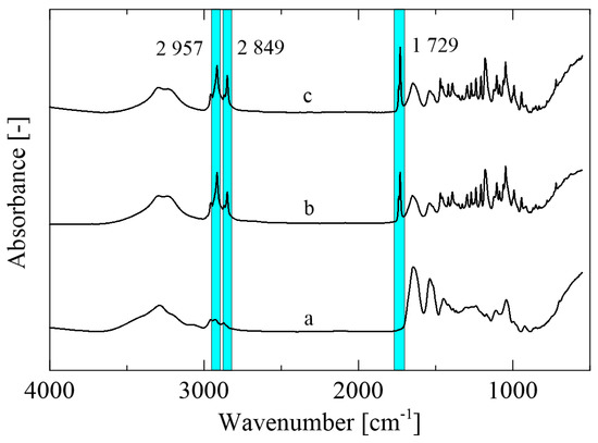 Mutual interactions between the zein polymer and selected active compounds were analyzed via FTIR-ATR spectroscopy (Figure 3). The spectrum of the control zein film (Figure 3a) shows the peaks characteristic for this type of polymer corresponding to amides I, II, and III at 3290 cm−1 (-NH2), 1645 cm−1 (C=O), and 1538 cm−1 (N-H, C-N), respectively. The peak at 1645 cm−1 confirms the presence of the higher amount of the α-helical secondary structure. On the other hand, the β-structure cannot be seen in the obtained spectra due to the absence of peaks at 1614 cm−1 and 1631 cm−1 [29]. The peaks at 1729, 2849, and 2957 cm−1 can be observed in the zein film enriched with active agents (Figure 3b,c), revealing the C=O and C-O stretching pertaining to the structure of the monolaurin molecule. A predominant role of monolaurin was confirmed, since the spectra of the sample with monolaurin and thyme essential oil did not reveal any significant changes [30].