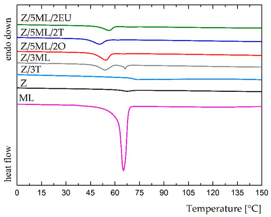Differential scanning calorimetry was used to study the potential interactions between the zein polymer and active compounds. The results from the first heating scan shown in the DSC pattern, for which the temperatures ranged from 0 to 150 °C, are shown in Figure 4. The thermogram of monolaurin showed a sharp endothermic peak at 65 °C, corresponding to the melting temperature of this surfactant. A comparable result was obtained by Chinatangul et al. [31]. The zein samples with monolaurin and its combinations with polyphenolic compounds exhibited suppressed endothermic peaks at a similar position. The glass transition temperature was not observed in these formulations, possibly as the consequence of the overlapped Tg of zein and the melting event of monolaurin [32]. The film containing 3 wt% thyme oil demonstrated a different result due to the absence of monolaurin in the mixture. A small endothermic peak of about 74 °C was shown in this thermogram. In the unmodified zein film, a peak at 67 °C was observed, corresponding to the glass transition temperature. A similar Tg value (68 °C) for the zein film was achieved in the study by Bueno [33]. The shift of this endothermic peak in the zein film toward zein modified with thyme oil could indicate the partial miscibility of these two components [34]. Generally, the presence of only one transition temperature is regarded as proof of the miscibility of individual components [32]. On the other hand, two peaks at 54 and 66 °C were revealed in the sample containing only 3 wt% monolaurin, which could indicate the worse miscibility of the zein polymer and monoglyceride, as was also supported by SEM analysis (Figure 5).