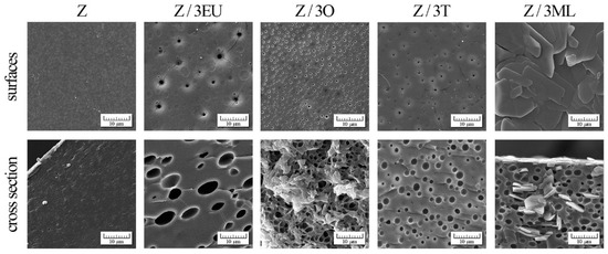 Figure 4 shows the SEM photographs of surfaces and cross-sections of zein films modified with essential oils, eugenol, and monolaurin. The significant morphological changes in the pores (with diameter increases of 334 ± 135, 501 ± 181, and 958 ± 440 nm on the surface and 1794 ± 492, 1 945 ± 623, and 4905 ± 1 970 in the cross-section for Z/3O, Z/3T, and Z/3EU, respectively) dispersed uniformly in the polymer matrix were proven in comparison with the control film. However, the surface of Z/3ML film exhibited an entirely different structure—a non-porous surface with flat plates. The addition of monolaurin caused the formation of irregular “flat sheet plate” structures caused by the polymorphic character of fatty acid monoglycerides.
