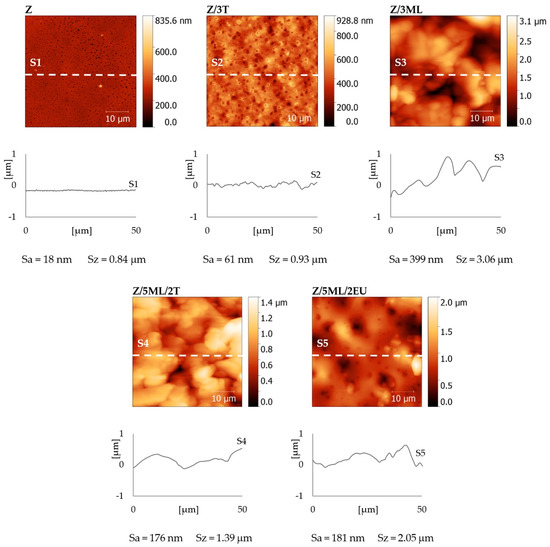 AFM height maps, surface cross-sections, and roughness (Sa) and maximal height (Sz) values of zein-based films with added active compounds. Z, zein; T, thyme; EU, eugenol; ML, monolaurin; 3: 3 wt%.