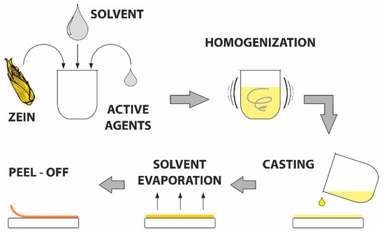 Zein-based films were prepared following the process used in [54] with slight modifications, as schematically displayed in Figure 8. The mixture of zein powder and ethanol (17 wt%) was homogenized under continuous stirring (30 min), after which the filtration was implemented to remove undissolved particles. Next, glycerol was added (4 wt%) and this mixture was boiled for 5 min. When the solution cooled down, the bioactive agents were added in defined concentrations (see Table 1). The solution without active substances was used as a control.