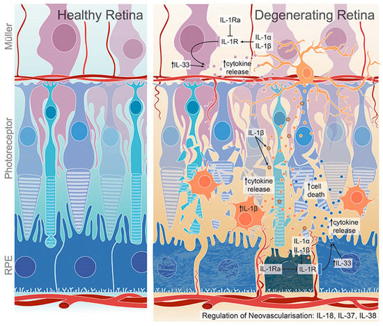 IL-1 family members and their role in retinal degeneration. Activated microglia/macrophages secrete IL-1β, which further induce the release of chemokines and cytokines from Müller and RPE cells, promoting microglia/macrophage recruitment to the inflamed retina. The expression of IL-1Ra, which is a competitive antagonist for IL-1R, is dysregulated in degenerated retina. IL-33 regulates cytokine expression in dry AMD. IL-18, IL-37 and IL-38 have both pro- and anti-angiogenic effects and regulate retinal neovascularization. Adapted from Wooff et al. [19].