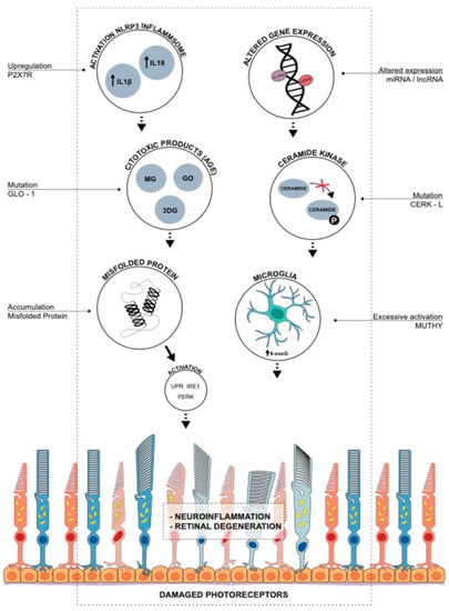 The influence of genetic factors on retinal disorders is well documented [20]. Genetic factors involve not only pro-inflammatory genes but also anti-inflammatory genes with neuroprotective functions. In the cascade of its initiation to the development of the disease phenotype, several pro-inflammatory genes become activated and are promptly counterbalanced by anti-inflammatory responses [21]. The imbalance in these inflammatory responses results in the progression of degenerative retinal diseases. The expression of genetic factors is regulated both at transcriptional and translational levels to ensure the induction immune response to avoid tissue degeneration [22]. Researchers have witnessed a timely shift in the association of genetic factors with apoptosis to necroptosis and/or pyroptosis for degenerating photoreceptors [23]. The caspase3 activation and apoptosis of photoreceptors are observed in RP mice models such as rds, rd1, and rd10 [24,25,26,27]. The increased expression of RIP1K/RIP3K molecules is linked with necroptosis in P23H-1 rhodopsin rats [23]. The high levels of NLRP3 inflammasome components (NLRP3, active caspase 1, and IL-1β) are associated with increased pyroptosis in murine and canine models of RP [23,28,29].
