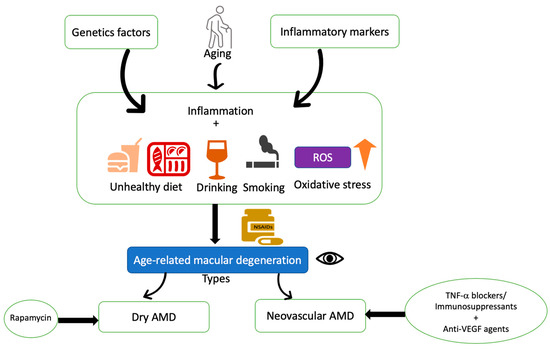 Schematic diagram of therapeutic rationale for non-vascular and neovascular AMD. Age-related macular degeneration is a complex disease affected by various factors, such as genetic factors, aging, inflammatory effects, and oxidative stress. Several risk factors such as unhealthy diet, smoking, alcohol consumption, and obesity are related to oxidative stress. Topical or intravitreal use of non-steroidal anti-inflammatory drugs has shown a preventive effect on AMD. Anti-inflammatory agents/immunosuppressants along with anti-VEGF therapies are currently in use for neovascular AMD treatment. Rapamycin is in clinical trials for Dry AMD.