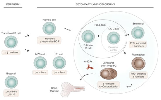 B cell lineage development and altered B cell populations in ANCA-associated vasculitis (AAV). Schematic representation of human B lineage cell differentiation. Beige boxes highlight the effects of AAV on the indicated cell populations. The extra-follicular pathway of B cell differentiation is not shown for simplicity. Transitional B cells migrate into secondary lymphoid organs, where they differentiate into innate-like B1, marginal zone B (MZB) cells, or naive B cells. Naive B cells enter lymph nodes and become follicular B cells, and it is within the follicle that a T-cell dependent response triggers the formation of germinal centers (GCs). During the GC reaction, the GC B cell may generate memory B cells (Bmem), plasmablasts, or plasma cells (PCs), which reduce the pathogenic anti-neutrophil cytoplasmic antibodies (ANCAs). PCs may be short- or long-lived and home to the bone marrow, whereas Bmem egress into the periphery. B regulatory cells (Breg) may arise from almost all B cell lineage populations. All the aforementioned B cell populations have been found to be dysregulated in AAV, being increased or decreased, as shown by the arrows in the beige boxes. Abbreviations: PR3 (proteinase 3), BCR (B cell receptor).