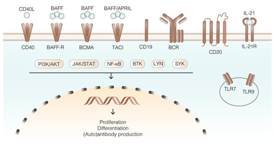 The BCR is central in the differentiation and effector function of B lineage cells. For instance, BCR triggering enhances BAFF-R signalling, which is necessary for a more mature transitional B cell population, named T2 cells. The importance of the BCR is further illustrated by the implication of various of its downstream BCR signalling molecules, including Lck/Yes related novel protein tyrosine kinase (LYN), spleen tyrosine kinase (SYK), Bruton’s tyrosine kinase (BTK) [], and phosphatidylinositol-3 kinase (PI3K) [] in antibody-mediated autoimmune diseases (reviewed in []). Interestingly, BCR signalling also contributes to the production of important effectors of the NF-κB signalling pathway [,]. The BCR has different co-receptors, including CD19 and CD20, which enhance its signalling capacity. CD19 has been found to be dysregulated both in SLE and AAV, distinguishing between low and high expression in different B cell populations []. Naive B cells were CD19low, leading to weaker downstream BCR signalling and probably the escape from selection mechanisms for self-recognition. However, Bmem were CD19hi, which makes them more sensitive to BCR signalling and therefore to proliferation and differentiation []. CD20 is a transmembrane protein on B cells [] which was found to be involved in BCR and CD40 signalling. CD20 is expressed throughout all B cell development stages, but it is downregulated in PCs []. As mentioned, CD20 is one of the most relevant targets on B cells, as shown by the benefits of B cell depletion by the anti-CD20 antibody RTX.