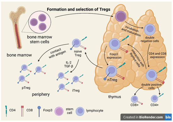 All T cells originate from bone marrow stem cells and incubate and mature as a cell line in the thymus. At the double-negative (DN) stage, all T cells start as CD4-CD8-T-cell receptor (TCR) cells. At this stage, some cells change their T-cell receptor genes to form a unique functional molecule. After receiving the signal, they proliferate and simultaneously express CD4 and CD8, thus becoming double-positive cells. In this stage, they are selected by their interaction with cells in the thymus, starting with forkhead box P3 (Foxp3) transcription and becoming Treg cells, the well-described population of Foxp3+ Tregs. TCR expression is characteristic of Tregs. There are more diverse TCRs than effector T cells acting toward self-peptides [13,14,15,16]. The process of the formation and selection of Tregs is illustrated in Figure 1.
