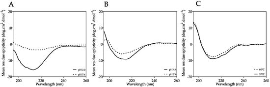 - Micsonai, A.; Wien, F.; Bulyáki, E.; Kun, J.; Moussong, E.; Lee, Y.-H.; Goto, Y.; Réfrégiers, M.; Kardos, J. BeStSel: A web server for accurate protein secondary structure prediction and fold recognition from the circular dichroism spectra. Nucleic Acids Res. 2018, 46, W315–W322. [Google Scholar] [CrossRef] [PubMed]