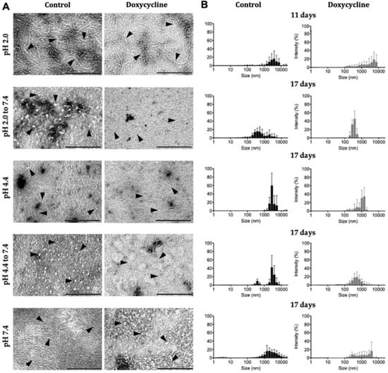 When the fibrils assembled at pH 2.0 underwent pH adjustment to 7.4 and were then treated with doxycycline, the disruptive effect was visible after 17 days both by TEM, with a decrease in the size of the non-fibrillar structures with diameters of 4 nm (Figure 2A, pH 2.0 to 7.4), and DLS, with the disappearance of particle populations equal to or larger than 1000 nm (Figure 2B, pH 2.0 to 7.4).