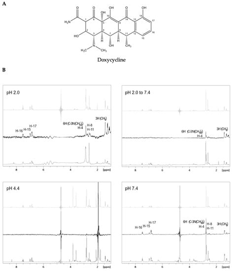 At pH 7.4, the doxycycline protons involved in the interaction with the heat-induced fibrils were similar to those at pH 2.0 (Figure 3B, pH 7.4).