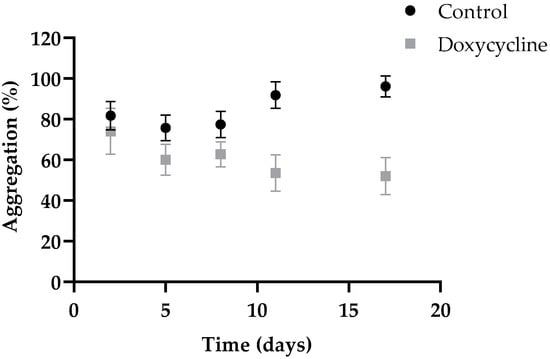 The disruptive effect of doxycycline was also observed in the pre-assembled aggregates/fibrils at pH 4.4 after 17 days of incubation. A decrease in the size of fibrillar structures following treatment with doxycycline was observed by TEM (maximum of 15 nm in length and diameter between 3 and 4 nm) (Figure 2A, pH 4.4). DLS results showed that the control sample had sizes ranging between 1000 and 10,000 nm, whereas in the doxycycline-treated sample, a decrease in the larger size particle populations and an increase in the smaller size populations between 100 and 1000 nm was noticeable (Figure 2B, pH 4.4). Additionally, a turbidity assay was also performed to further characterize the disruptive effect of doxycycline over time in preformed amyloid material (Figure 4). A more pronounced decrease in the turbidity of doxycycline-treated samples was observed at day 11, demonstrating that the aggregated species in solution were smaller or/and in smaller amount. This effect increased in the following days, reaching a maximum at day 17 with an aggregation estimate of approximately 50% of the control.