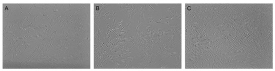 Figure 1. Live cell microscopy showing general morphology of the stem cells isolated from three distinct locations: (A) abdomen, (B) thigh, and (C) chin. All cells were isolated using the same process and plated into culture flasks at an equal density of 1000 cells/mm2. Cells were cultured for 336 h with growth medium changed at 84 h intervals. Live images were captured on an EVOS2 prior to harvest. The abdominal (A) and thigh (B) cultures yielded equivalent cell numbers and percentage confluency at the final timepoint, whereas the chin (C) cultures showed an average 10% higher final timepoint percentage confluence.