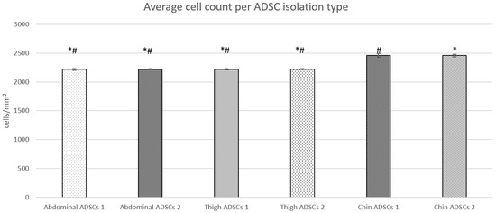 Figure 2. Average cell count across each ADSC isolation type in biological replicates. Abdominal ADSCs and thigh ADSCs shared a similar average count, whereas chin ADSCs showed an average of 10% more cells with no significant difference between each isolation. Student’s t-test was performed between all sample types in a single-tail homoscedastic test, where the p-value is presented as * p < 0.05 and # p < 0.05 compared to Chin ADSCs 1 (*) and Chin ADSCs 2 (#). This shows that both abdominal and thigh ADSC isolations had a significant statistical difference in average cell count when compared to both chin ADSC isolations average cell counts.