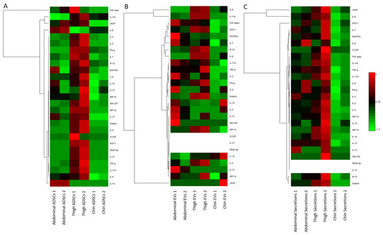 From each ADSC isolation (abdominal, thigh, and chin), three subsample categories were derived, i.e., cellular samples, extracellular vesicles (EVs), and secretions. Cytokine expression from each subsample was analysed using the bioplex 27-plex human proinflammatory kit to quantitatively measure 27 distinct cytokines simultaneously in each sample for comparison. To clarify and summarise the complex datasets, three Euclidean clustering dendogram and heatmap images were generated (Figure 3) to examine the cytokine changes in cellular samples (Figure 3A), EVs (Figure 3A,B), and secretions (Figure 3A,C). In a general summary, the heatmaps show there are distinct variations in cytokine content among the three ADSC isolation samples, as well as further variation in content and concentration in the subsample categories of cellular samples, EVs, and secretions.