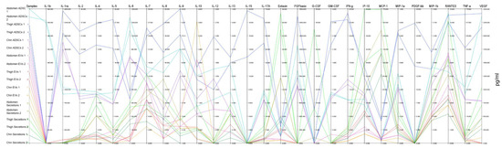 Figure 4. Parallel coordinates plot of Bioplex-27plex cytokine measure with all cytokines on unique linear y-axis and each sample denoted by coloured line travelling through its measured cytokine concentration in pg/mL. Abdomen ADSCs (turquoise), thigh ADSCs (blue), chin ADSCs (purple), abdomen EVs (pink), thigh EVs (orange), chin EVs (yellow), abdomen secretions (gold), thigh secretions (light green), chin secretions (dark green).