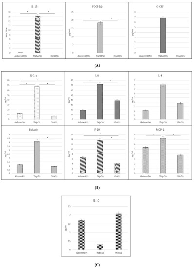 Figure 5. Critical cytokine content comparison graphs: (A) ADSC cytokine content of IL-15, PDGF-bb, and G-CSF from ADSCs with the highest measures in thigh ADSCs; (B) EV cytokine content for IL-1ra, IL-6, IL8, Eotaxin, IP-10, and MCP-1 with the highest measures in EVs; (C) IL-10 content with the highest measure in chin EVs. * p < 0.05 according to Student’s t-test.