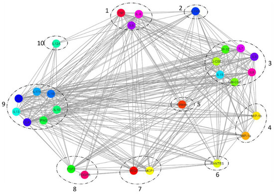 Figure 6. Cytokine interaction network for 27-plex, mapping high interactivity among IL-1b, IL-1rn, IL-2, IL-4, IL-5, IL-6, IL-7, IL-8, IL-9, IL-10, IL-12, IL-13, IL-15, IL-17A, Eotaxin, FGF-basic, G-CSF, GM-CSF, IFN-γ, IP-10, MCP1, MIP-1a, MIP-1b, PDGFB, RANTES, TNF-α, and VEGF, with 307 interactions and an average of 22.7 interactions per cytokine. Ten distinct groups are circled on the basis of the interactivity similarity of node clusters across the network.