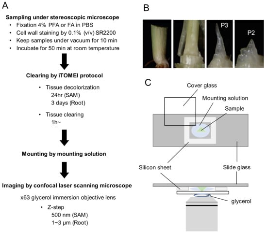 Fourth, the mounted samples were observed using a confocal laser scanning microscope equipped with a 63× glycerol-immersion objective lens. In order to collect a sufficient number and density of Z-stacked images for 3D reconstruction, we set the Z step at 500 nm for SAMs and 1–3 µm for root tips (Figure 1A).