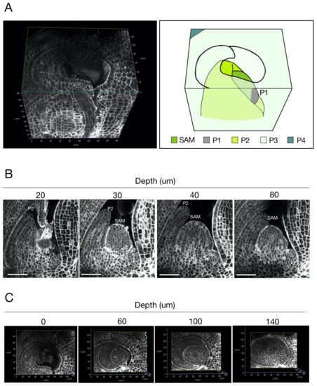We reconstructed the SAM in 3D from serial longitudinal sections and, using this reconstruction, we were able to obtain transverse sections of the same SAM (Figure 2C). We detected cell-wall staining throughout the transverse sections, enabling us to observe structures at cellular resolution. In summary, our protocol resulted in a series of images showing the precise cellular arrangement of the SAM and leaf primordia in 3D.