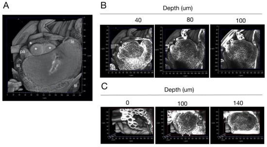 We examined how large organs can be observed based on this protocol. We used a mature anther, which is composed of four pollen sacs [22]. The mature pollen sac is approximately 1 mm long and 0.2 mm wide. Because the object to be scanned is large, it is necessary to use a ×20 lens. Thus, the anther was cleared with ClearSee, which has a refractive index suitable for this lens [10]. In order to create a single image of the entire object, the images were concatenated and reconstructed (Figure 4A and Supplementary Materials Video S4). As a result, the entire image of the pollen sacs could be observed. In the central section of the pollen sacs, we observed aligned epidermal cells, degenerated second layer, and germination pore of the pollen grains. When the tip of the pollen sacs was magnified with a ×40 lens, the structure of the pollen sacs and pollen grain could be clearly observed (Figure 4B and Supplementary Materials Video S5). In particular, the morphology of the second layer of cells in the pollen sacs could be observed more clearly.