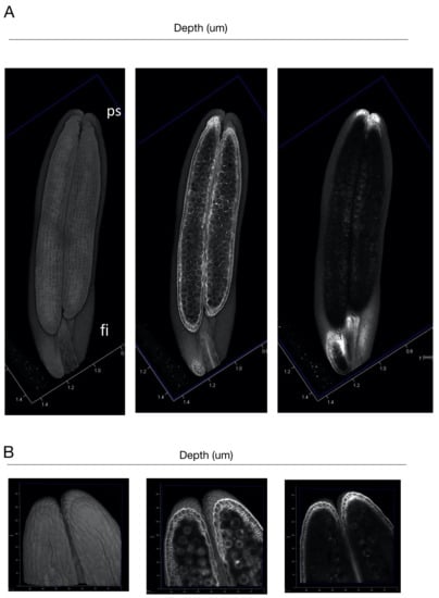 - Sakamoto, Y.; Ishimoto, A.; Sakai, Y.; Sato, M.; Nishihama, R.; Abe, K.; Sano, Y.; Furuichi, T.; Tsuji, H.; Kohchi, T.; et al. Improved clearing method contributes to deep imaging of plant organs. Commun. Biol. 2021, in press. [Google Scholar] [CrossRef]
