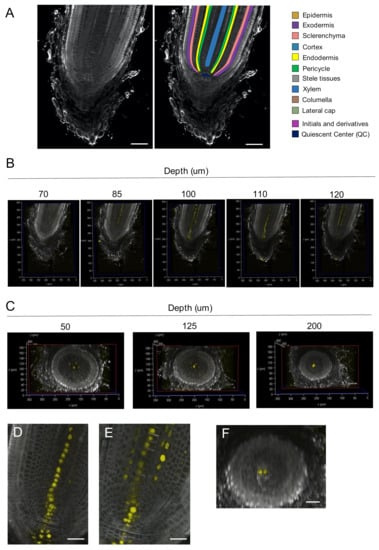 Next, we examined whether our method could be used to image roots and whether the method was suitable for fluorescence observations. Rice roots consist of several tissues; from the interior to the exterior, the tissues include the central stele with vascular bundles, the endodermis, the cortex, the sclerenchyma, the exodermis, and the epidermis [3]. The columella and the lateral root cap are located in the root tip. We acquired longitudinal sections of the root tip and confirmed that these tissues were distinguishable in our observations (Figure 5A,B). We reconstructed a 3D image of a root tip from serial longitudinal sections and examined the transverse sections (Figure 5C, Supplementary Materials Video S6). The transverse sections showed that organ shape was maintained in this orientation, and the positional relationship of the central-lateral axis was preserved; however, we could not distinguish each cell in the reconstructed transverse sections of root tips because the Z-step spacing was not sufficiently dense.