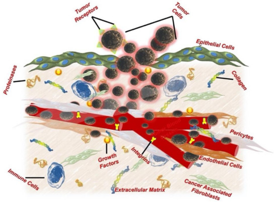 Cancer, vitally different from adjacent tissue, grows uncontrollably in a specific conditioned environment known as the cancer microenvironment. This niche provides the essentials for clonal expansion and barricades access to the tumor core from external biological factors. This specialized environment is a complex organization of various physical, chemical, and biological players that work together to nurture the growing tumor. The tumor microenvironment is well known for its cellular heterogeneity, comprising stromal cells, fibroblasts (cancer-associated fibroblasts), angiogenic endothelial cells, and tumor-associated immune cells. The other major non-cellular components of this niche include the extracellular matrix (ECM), matrix metalloproteinase (MMP), tumor growth factors and receptors. In addition to biological entities (cellular and non-cellular components), physical and chemical factors such as acidosis, hypoxia, and interstitial fluid pressure also differentiate the tumor microenvironment from a normal cell niche [22,23,24,25,26,27,28,29]. These factors collectively interact within themselves and nurture tumor promotion, progression, and metastasis (Figure 1).
