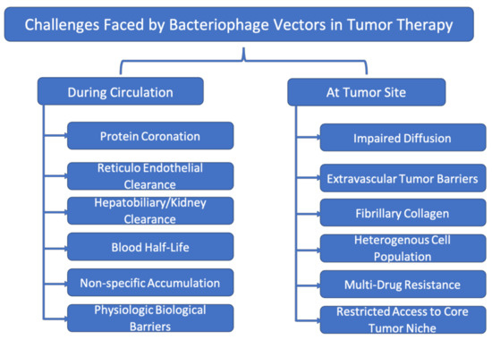 Though we have discussed about the advantages of phage vector systems for cancer theragnostics, there are quite a few challenges that are yet to be addressed. The challenges faced by therapeutic phage vectors during circulation and at tumor sites are discussed below as well illustrated in Figure 2: